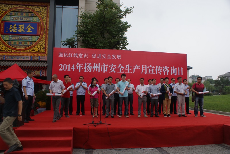 6月16日上午,揚(yáng)州市安委辦會同蜀崗—瘦西湖風(fēng)景名勝區(qū)管委會在虹橋坊舉行了以“強(qiáng)化紅線意識,促進(jìn)安全發(fā)展”為主題的2014年揚(yáng)州市“安全生產(chǎn)月”宣傳咨詢?nèi)栈顒。市安委會、市安監(jiān)局、蜀岡—瘦西湖風(fēng)景名勝區(qū)管委會、市人保公司負(fù)責(zé)人出席了活動。市安監(jiān)局、揚(yáng)汽集團(tuán)、市城建控股集團(tuán)、市工藝美術(shù)集團(tuán)、金茂化工集團(tuán)、揚(yáng)子江集團(tuán)、建工控股集團(tuán)等11家單位以及消防、建筑、燃?xì)狻庀、質(zhì)監(jiān)、部分駐揚(yáng)單位的職工代表共計(jì)400余人參加了活動。