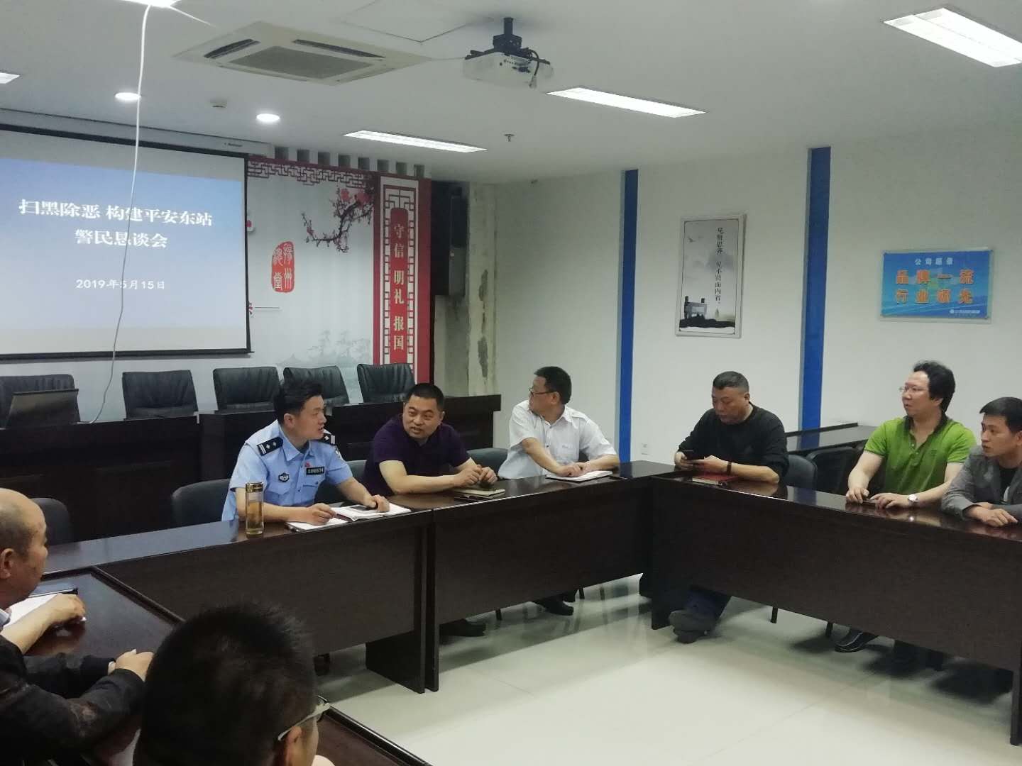 2019年5月15日上午9點(diǎn)30分,東站召開掃黑除惡專題工作動(dòng)員大會(huì),東站支部書記、管理人員、班組長(zhǎng)和超市及賓館等商戶參加了會(huì)議,會(huì)議由揚(yáng)州市公安局公交分局東站派出所所長(zhǎng)李方民主持。