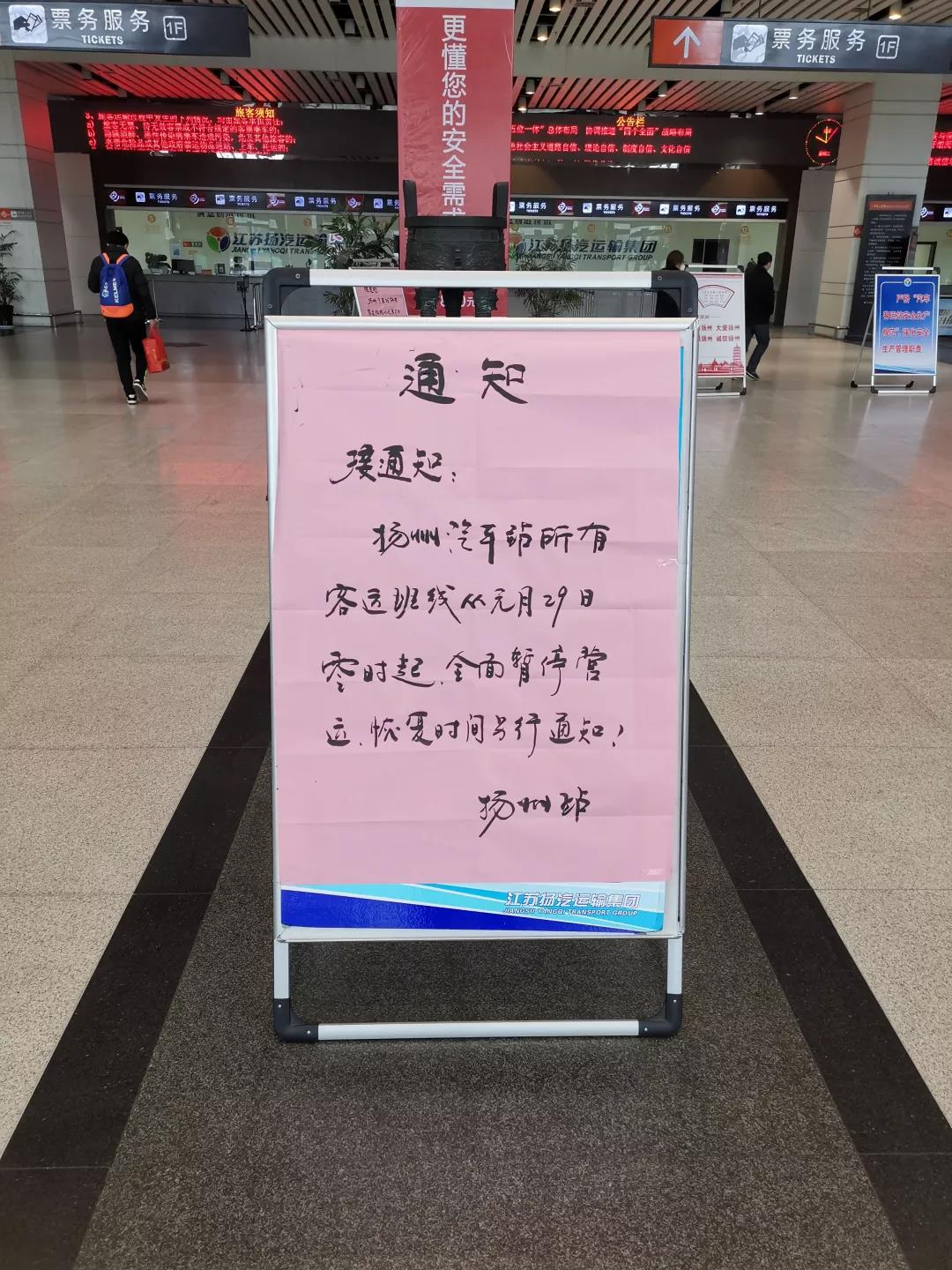 為進(jìn)一步配合我市做好新型冠狀病毒感染的肺炎疫情防控工作,遏制疫情通過交通渠道擴(kuò)散傳播,揚(yáng)汽集團(tuán)根據(jù)揚(yáng)州疫情防控工作需要,決定從2020年1月29日0時起,暫停揚(yáng)州汽車站、揚(yáng)州汽車東站及江都汽車客運(yùn)站的運(yùn)營,停發(fā)所有客車班線,暫停所有包車客運(yùn)業(yè)務(wù)。